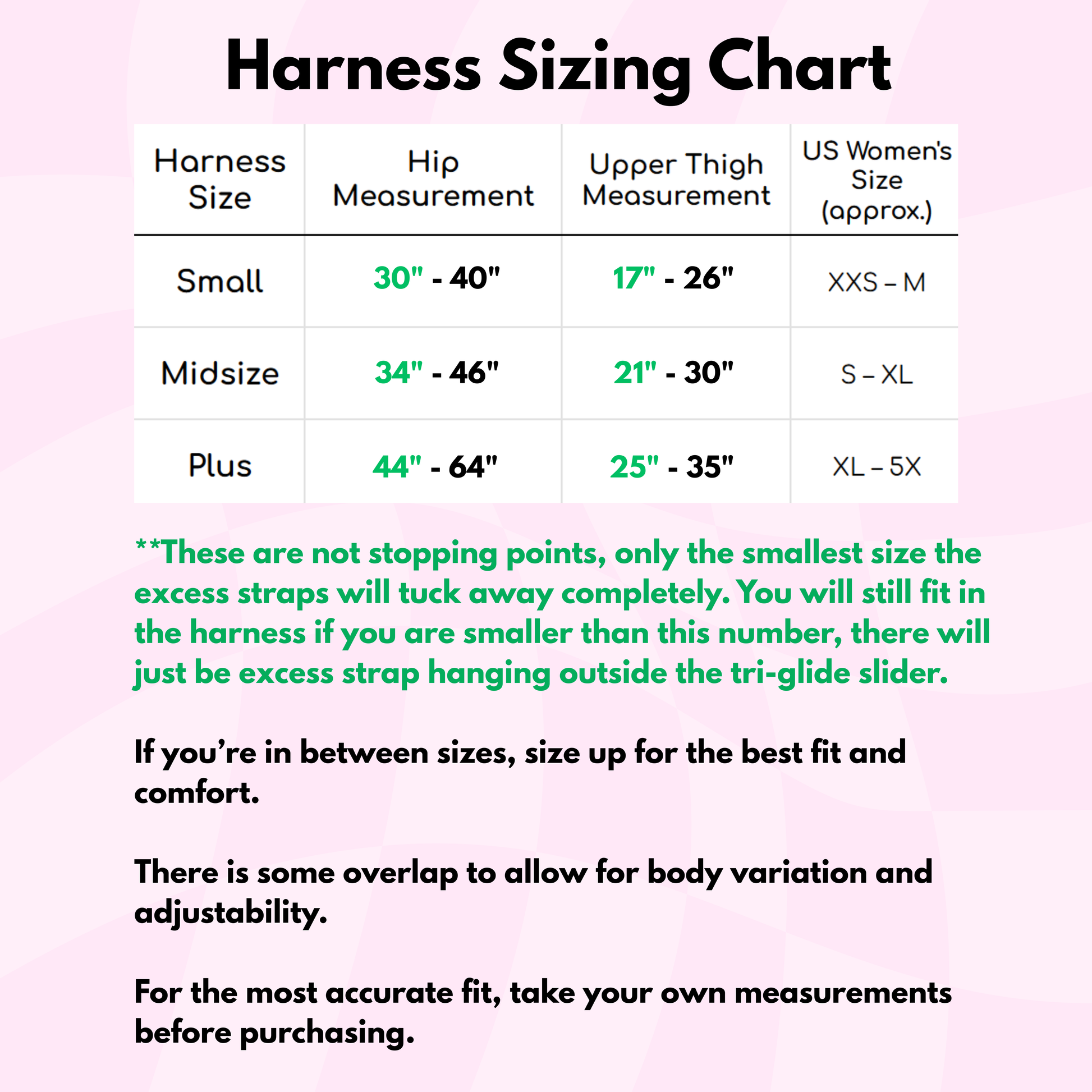 Sizing: Please see sizing chart shown in pictures of the item. Each harness is fully adjustable and designed to accommodate a wide range of body sizes. The size ranges listed are approximate, so we highly recommend measuring yourself for the most accurate fit before purchasing. If you fall between sizes, we suggest sizing up. You will still achieve a secure fit, however, there may be some excess strap that cannot be fully tucked away.