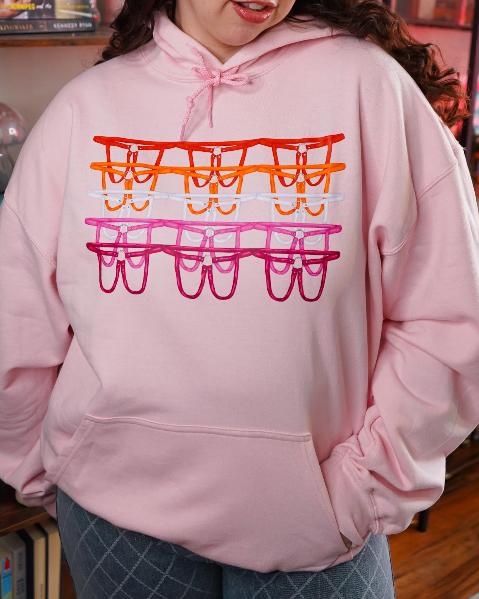Subtle (kind of) and queer, this t-shirt features the lesbian flag in repeating harnesses. Copyrighted graphic designed by Jade printed on a unisex Gildan Heavyweight Hoodie.